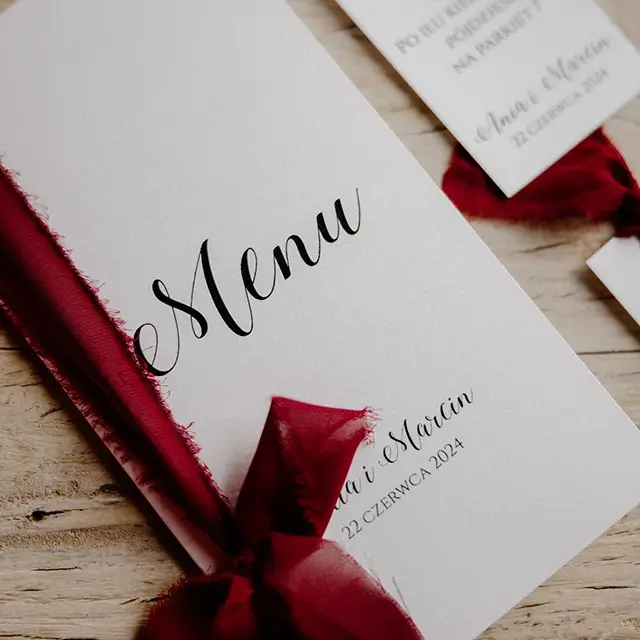 możesz zamówić: winietki, zawieszki na alkohol, wkładki, karteczki z podziękowaniami dla gości, karty menu, numerki na stoły, plan usadzenia gości, księgę gości, pudełko na koperty, pudełka na ciasto weselne