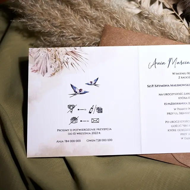 Na zaproszeniu zostały przedstawiony przykładowy wybór czcionek oraz ułożenia tekstów a także rebusów – istnieje możliwość zmiany.
