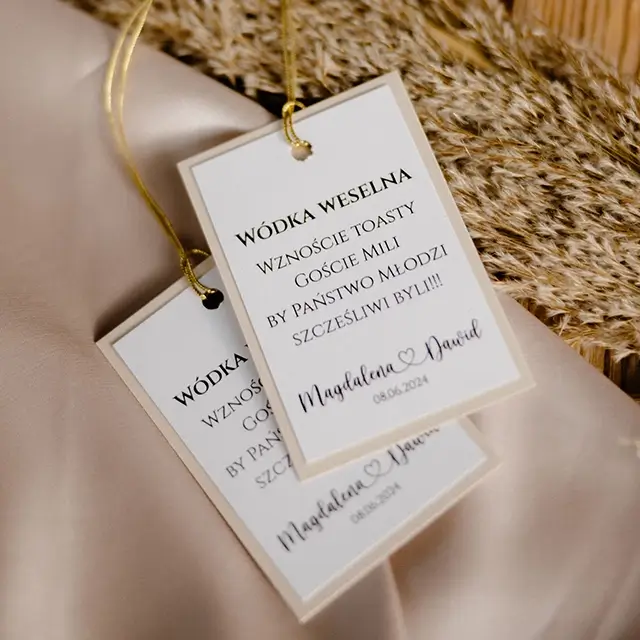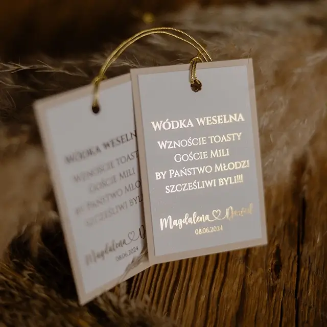 możesz zamówić: winietki, zawieszki na alkohol, wkładki, karteczki z podziękowaniami dla gości, karty menu, numerki na stoły, plan usadzenia gości, księgę gości, pudełko na koperty, pudełka na ciasto weselne
