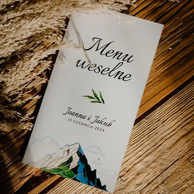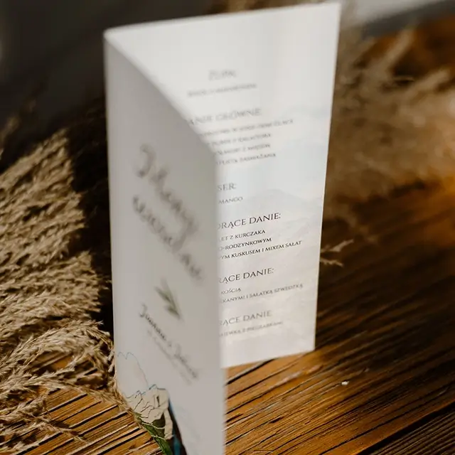 możesz zamówić: winietki, zawieszki na alkohol, wkładki, karteczki z podziękowaniami dla gości, karty menu, numerki na stoły, plan usadzenia gości, księgę gości, pudełko na koperty, pudełka na ciasto weselne