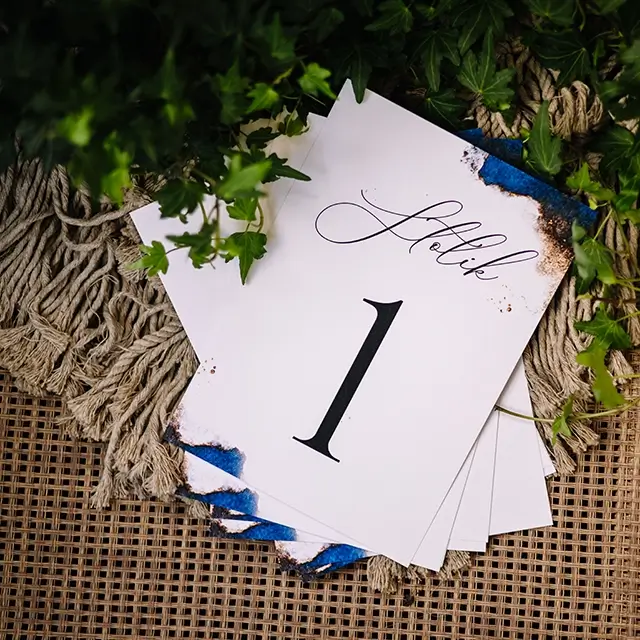 możesz zamówić: winietki, zawieszki na alkohol, wkładki, karteczki z podziękowaniami dla gości, karty menu, numerki na stoły, plan usadzenia gości, księgę gości, pudełko na koperty, pudełka na ciasto weselne