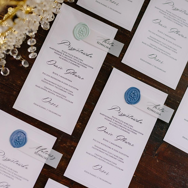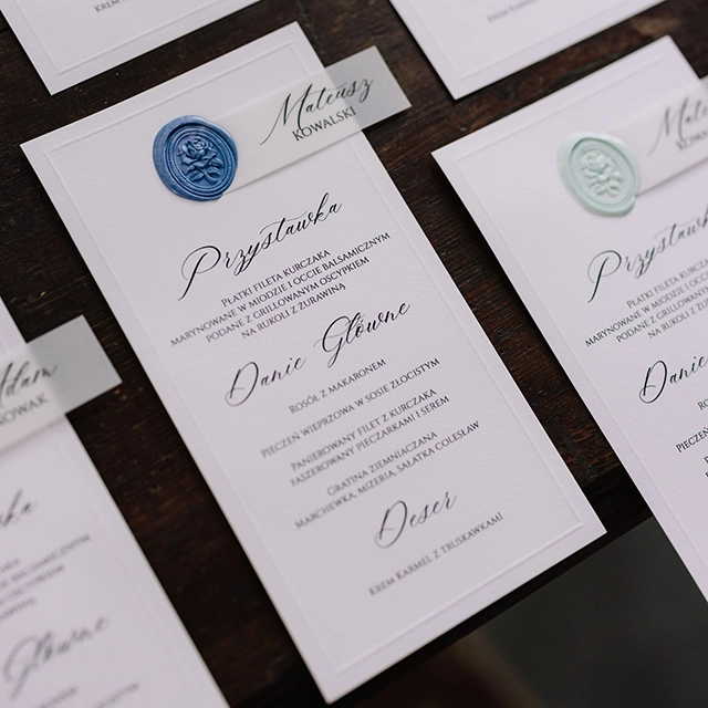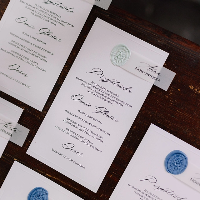 możesz zamówić: winietki, zawieszki na alkohol, wkładki, karteczki z podziękowaniami dla gości, karty menu, numerki na stoły, plan usadzenia gości, księgę gości, pudełko na koperty, pudełka na ciasto weselne
