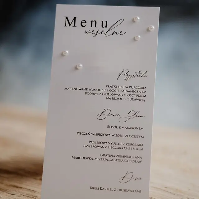 możesz zamówić: winietki, zawieszki na alkohol, wkładki, karteczki z podziękowaniami dla gości, karty menu, numerki na stoły, plan usadzenia gości, księgę gości, pudełko na koperty, pudełka na ciasto weselne