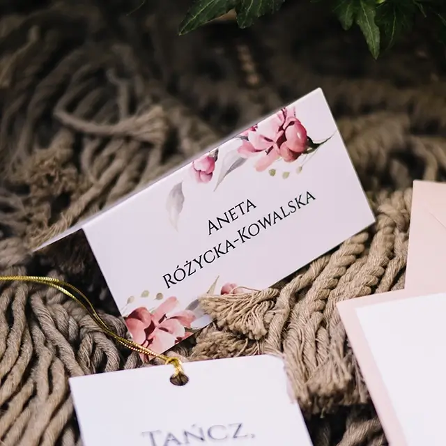 możesz zamówić: winietki, zawieszki na alkohol, wkładki, karteczki z podziękowaniami dla gości, karty menu, numerki na stoły, plan usadzenia gości, księgę gości, pudełko na koperty, pudełka na ciasto weselne