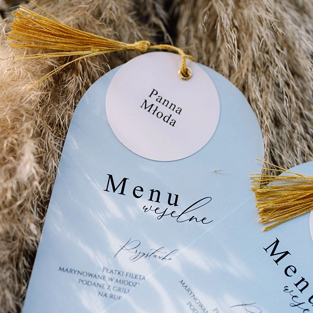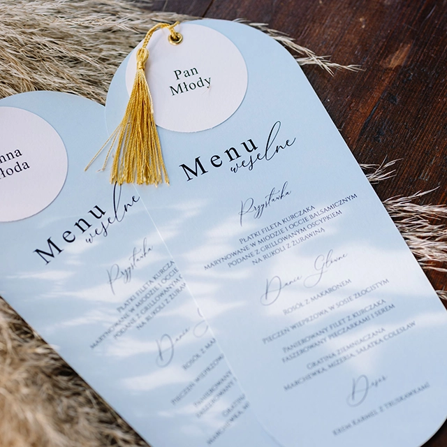 możesz zamówić: winietki, zawieszki na alkohol, wkładki, karteczki z podziękowaniami dla gości, karty menu, numerki na stoły, plan usadzenia gości, księgę gości, pudełko na koperty, pudełka na ciasto weselne