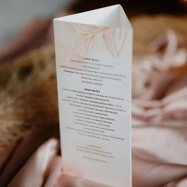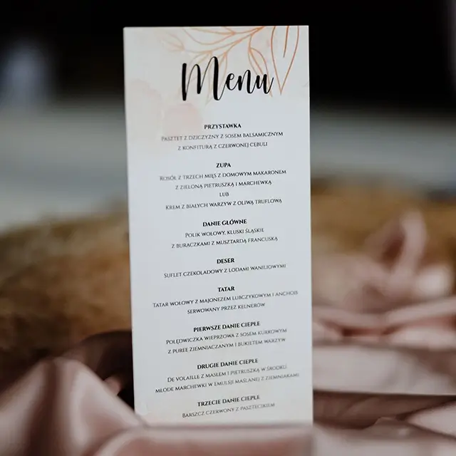 możesz zamówić: winietki, zawieszki na alkohol, wkładki, karteczki z podziękowaniami dla gości, karty menu, numerki na stoły, plan usadzenia gości, księgę gości, pudełko na koperty, pudełka na ciasto weselne