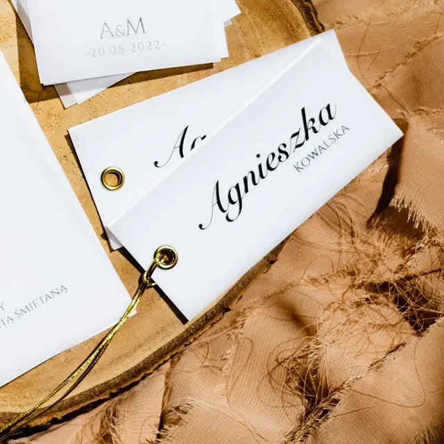 możesz zamówić: winietki, zawieszki na alkohol, wkładki, karteczki z podziękowaniami dla gości, karty menu, numerki na stoły, plan usadzenia gości, księgę gości, pudełko na koperty, pudełka na ciasto weselne
