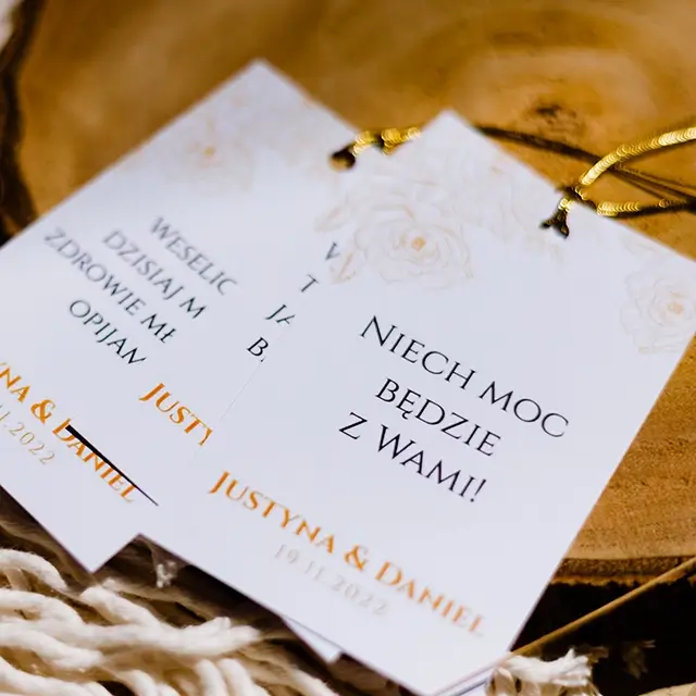 możesz zamówić: winietki, zawieszki na alkohol, wkładki, karteczki z podziękowaniami dla gości, karty menu, numerki na stoły, plan usadzenia gości, księgę gości, pudełko na koperty, pudełka na ciasto weselne