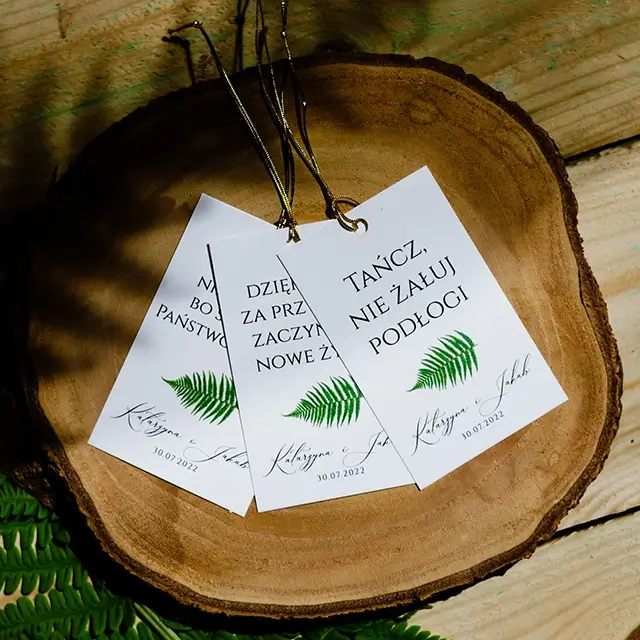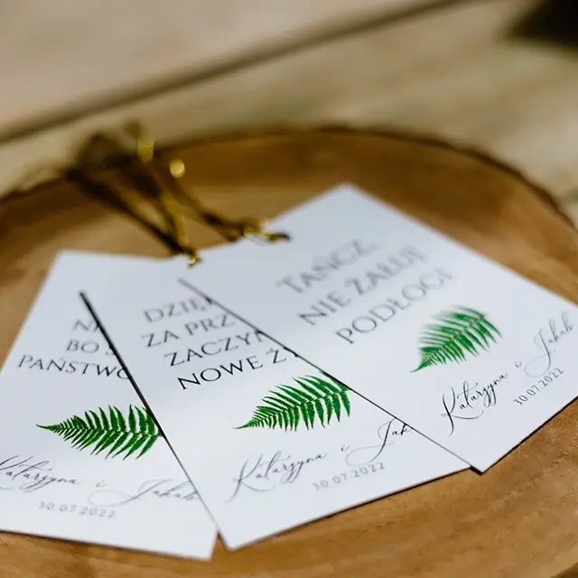 możesz zamówić: winietki, zawieszki na alkohol, wkładki, karteczki z podziękowaniami dla gości, karty menu, numerki na stoły, plan usadzenia gości, księgę gości, pudełko na koperty, pudełka na ciasto weselne
