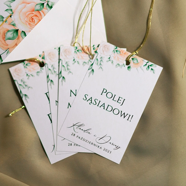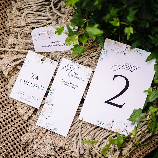 możesz zamówić: winietki, zawieszki na alkohol, wkładki, karteczki z podziękowaniami dla gości, karty menu, numerki na stoły, plan usadzenia gości, księgę gości, pudełko na koperty, pudełka na ciasto weselne